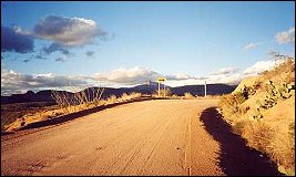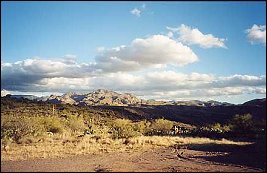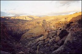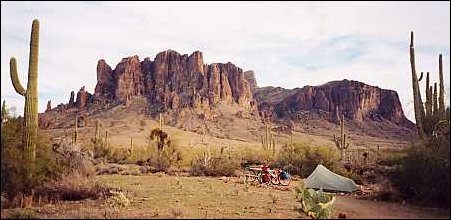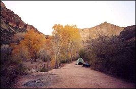 7:30 PM: Fish Creek Canyon. Total mileage today: 38 km (24 miles). I'm writing this by firelight. A small fire seemed like a good way to stay warm and deal with these long dark evenings. I got here just before dark (about 5:45), set up my tent on this bit of eroded road above the wash, and cooked dinner. Now I get to relax! One hell of a descent coming down here. Pavement ended just before the top of a killer hill (8 km of continuous uphill) out of Tortilla Flats. Around here, no pavement means sand. Very difficult to get traction. (Don't even think about trying this route unless you're touring on a mountain bike!) Last 2 km were single lane and incredibly steep going down. I'm sure I used up half my brake pads. Also loosing daylight rapidly at this point, so I was very relieved to see a potential campsite at the bottom. I just hope the rest of this unpaved section (22 miles in total) is a little less insane. Okay, the big question: Would I have gone this way if I'd known what was in store? Probably not - but its very beautiful, magnificent rocks, canyons, plants, and I'm happy to be here. Tomorrow?