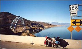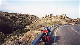 December 23rd. Headed through the community of Lake Roosevelt early this morning. There's a small store and restaurant here, but it was still closed when I went by. Long climb up to The Summit in the Salt River Mountains. Six miles at 9% grade. But at least it was on pavement. Then downhill and back uphill, but not nearly as much, to the junction with Highway 60. Turned east here towards Globe. This is an ugly 5 miles of highway. No shoulder, lots of traffic, and one fast food joint after another. Did take a lunch break at one of those, then continued into Globe. Stopped at the visitor's center, which was closed, but had some info leaflets outside.