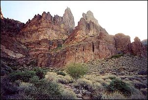 7:30 PM: Fish Creek Canyon. Total mileage today: 38 km (24 miles). I'm writing this by firelight. A small fire seemed like a good way to stay warm and deal with these long dark evenings. I got here just before dark (about 5:45), set up my tent on this bit of eroded road above the wash, and cooked dinner. Now I get to relax! One hell of a descent coming down here. Pavement ended just before the top of a killer hill (8 km of continuous uphill) out of Tortilla Flats. Around here, no pavement means sand. Very difficult to get traction. (Don't even think about trying this route unless you're touring on a mountain bike!) Last 2 km were single lane and incredibly steep going down. I'm sure I used up half my brake pads. Also loosing daylight rapidly at this point, so I was very relieved to see a potential campsite at the bottom. I just hope the rest of this unpaved section (22 miles in total) is a little less insane. Okay, the big question: Would I have gone this way if I'd known what was in store? Probably not - but its very beautiful, magnificent rocks, canyons, plants, and I'm happy to be here. Tomorrow?