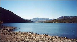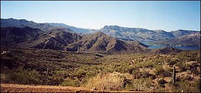 December 23rd. Headed through the community of Lake Roosevelt early this morning. There's a small store and restaurant here, but it was still closed when I went by. Long climb up to The Summit in the Salt River Mountains. Six miles at 9% grade. But at least it was on pavement. Then downhill and back uphill, but not nearly as much, to the junction with Highway 60. Turned east here towards Globe. This is an ugly 5 miles of highway. No shoulder, lots of traffic, and one fast food joint after another. Did take a lunch break at one of those, then continued into Globe. Stopped at the visitor's center, which was closed, but had some info leaflets outside.